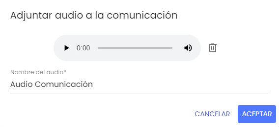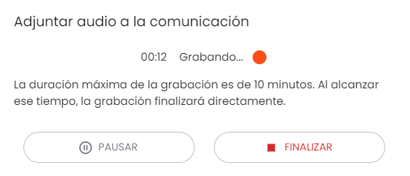 Grabar audio: Esta opción, permite una alternativa a la hora de registrar la información de la comunicación, pudiendo hacerlo mediante voz. Al pulsarlo, abrirá una ventana para poder comenzar la grabación.