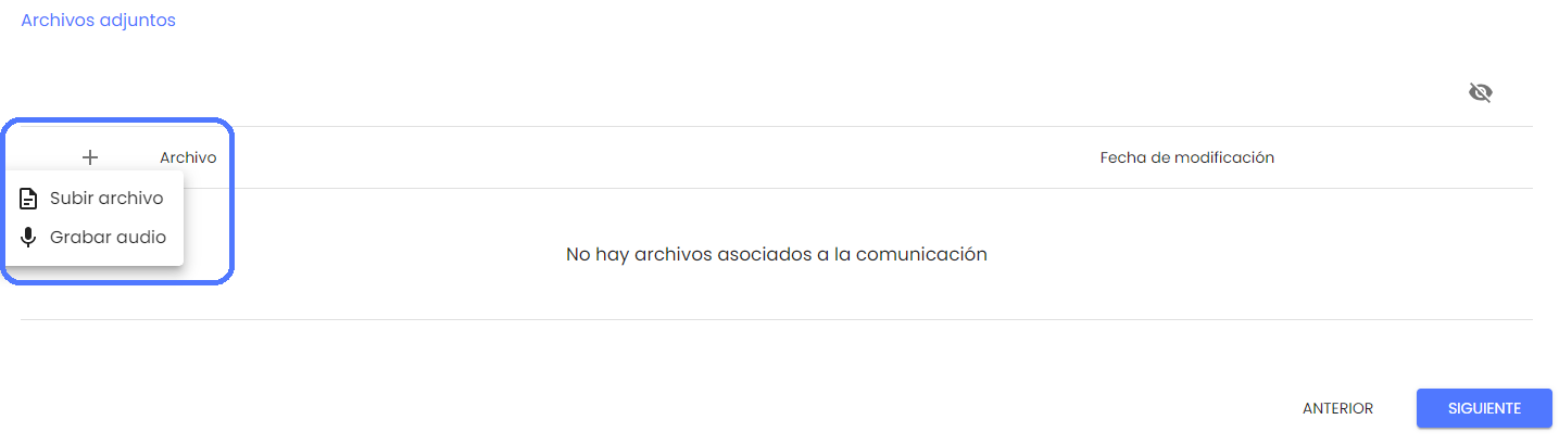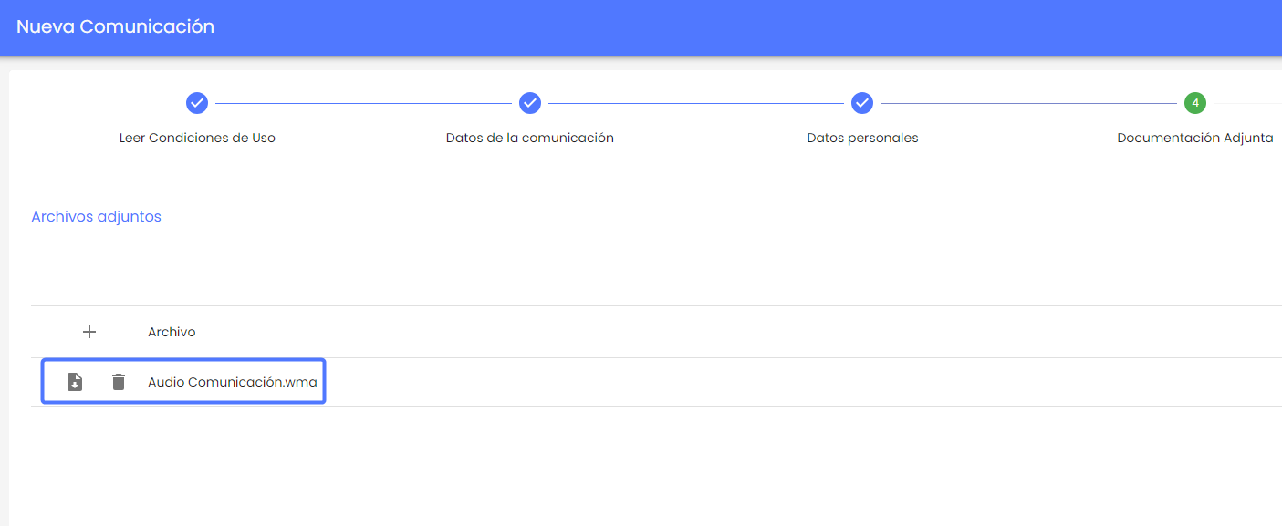 Subir archivo: Permite seleccionar un archivo del dispositivo local, y cargarlo en el formulario de la comunicación.