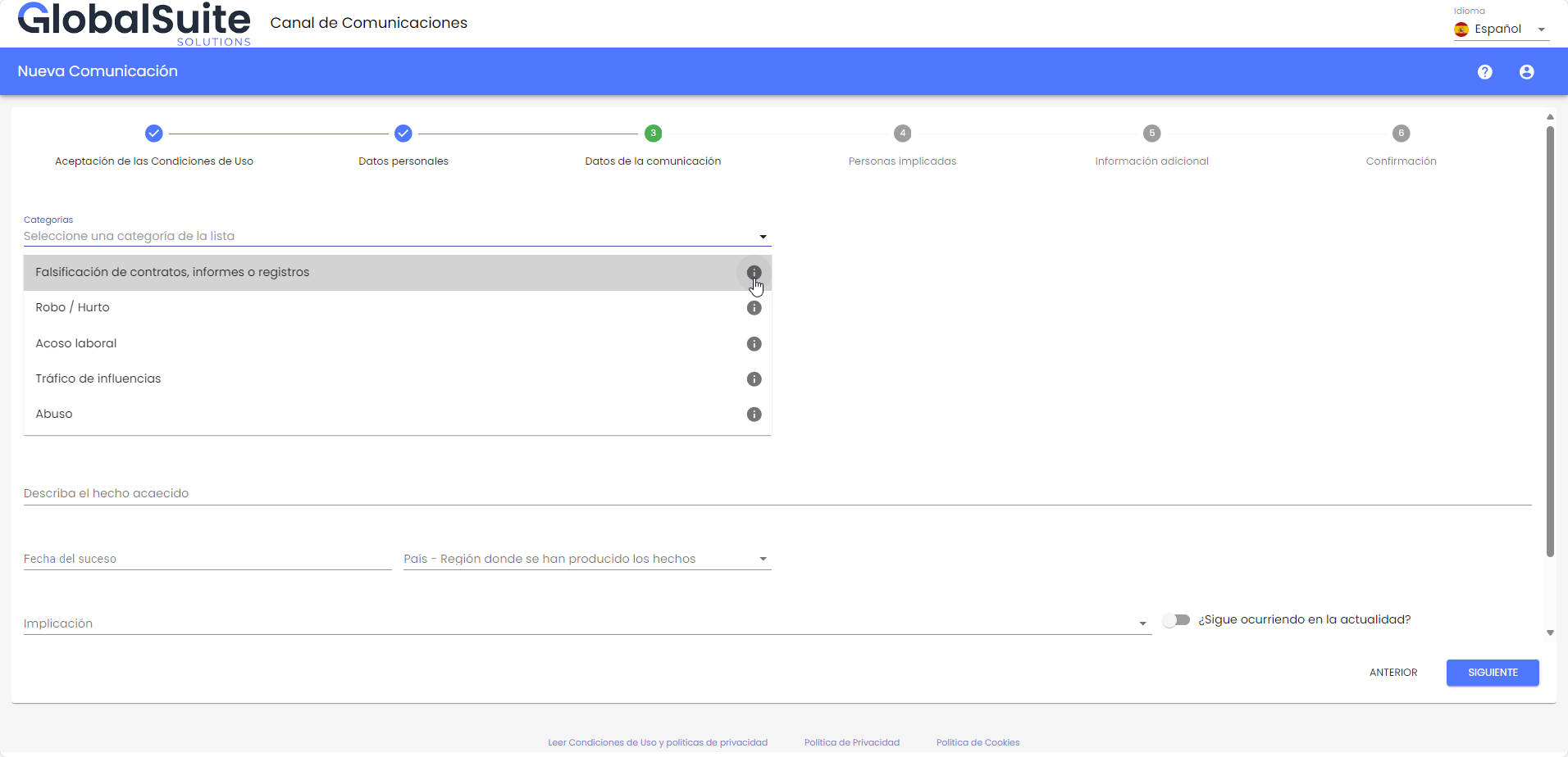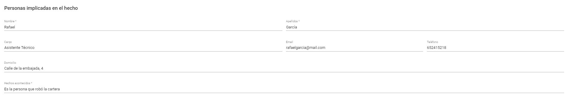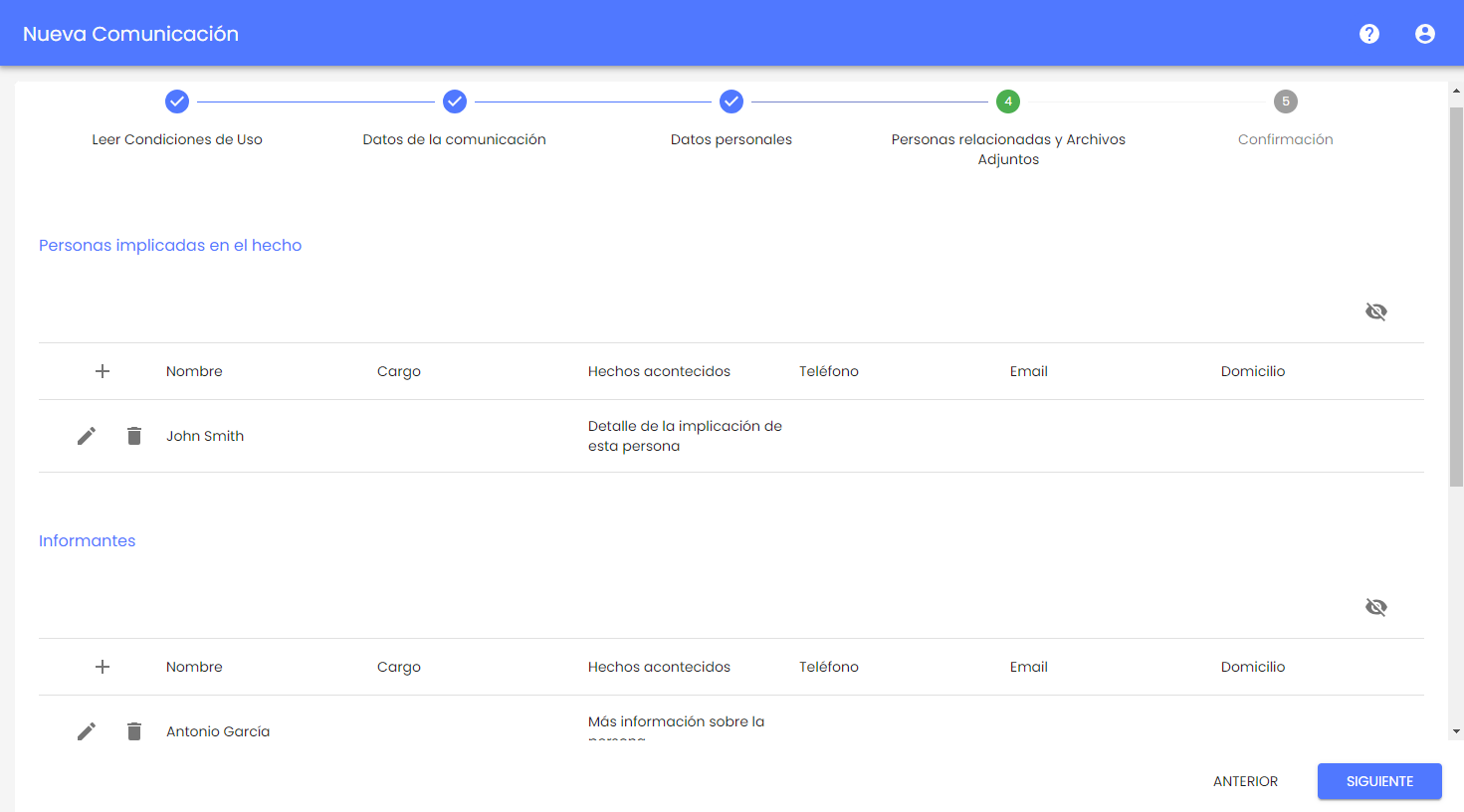 Permite informar sobre personas implicadas en el hecho comunicado, personas informantes que puedan tener más información al respecto y adjuntar archivos que sirvan como pruebas o evidencias del suceso.