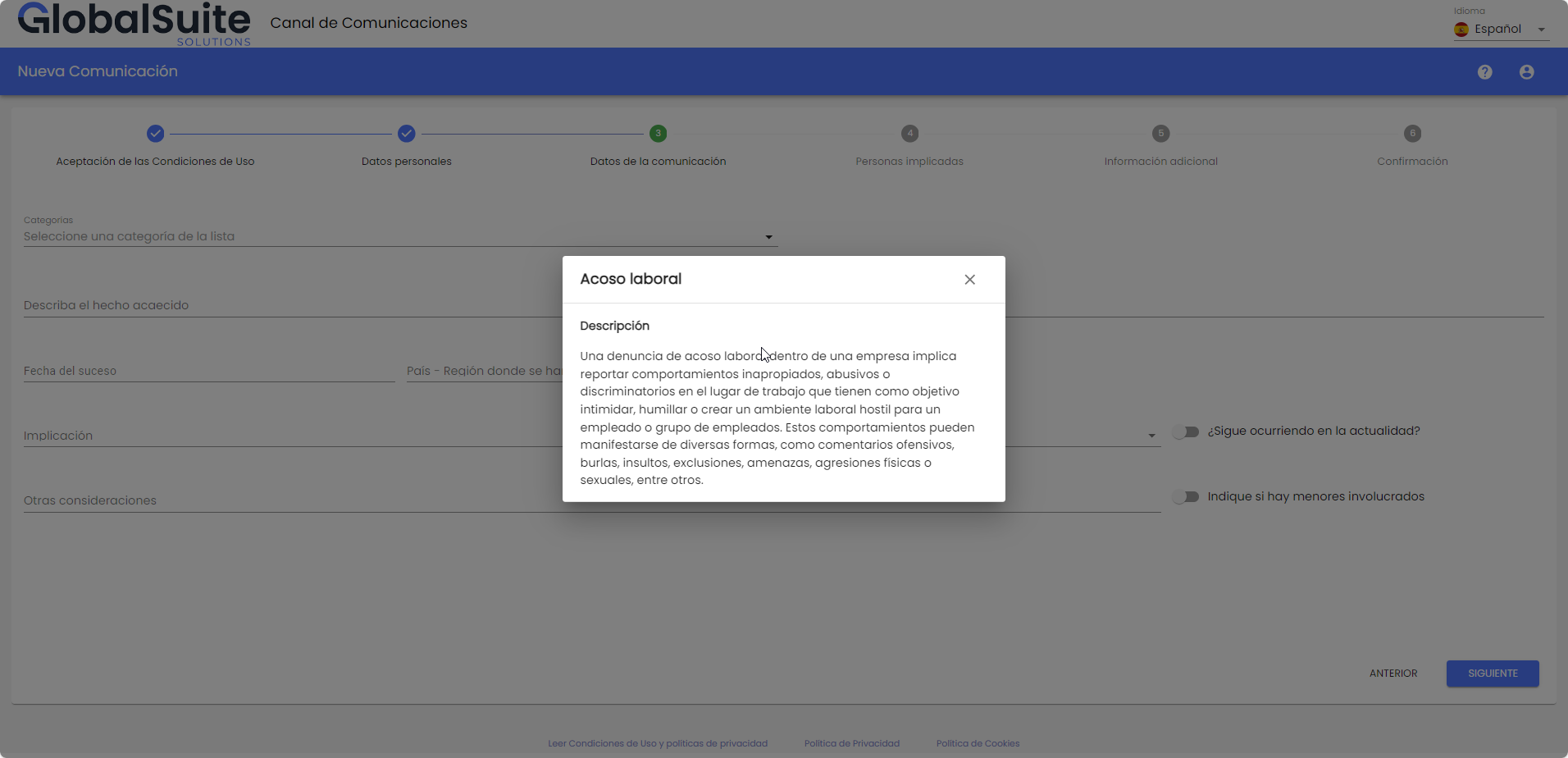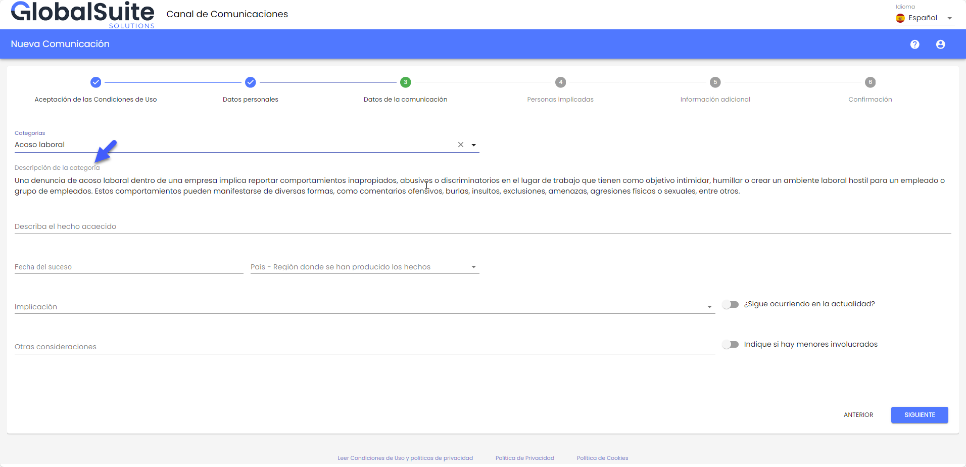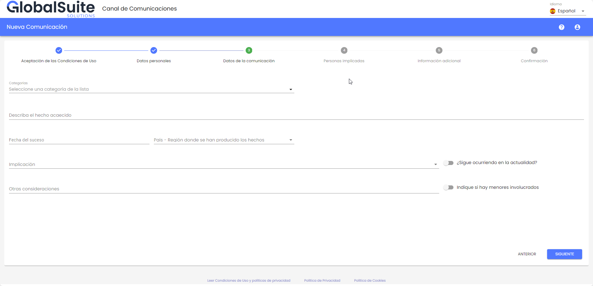 Permite informar sobre personas implicadas en el hecho comunicado, personas informantes que puedan tener más información al respecto y adjuntar archivos que sirvan como pruebas o evidencias del suceso.