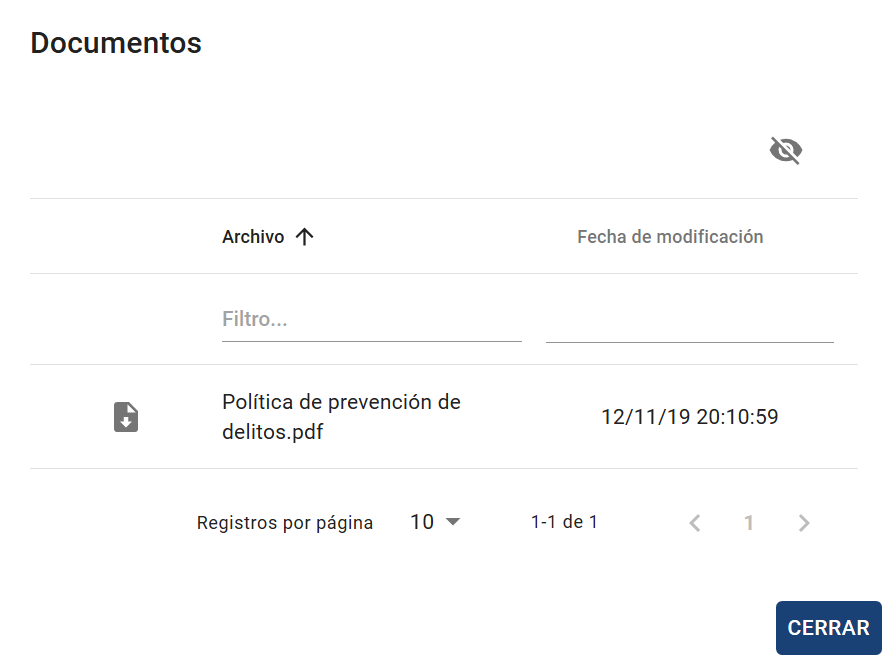 Al pulsar el botón, aparece el listado de documentos. En caso de no existir ninguno, aparecerá el enlace para acceder a este manual de usuario.