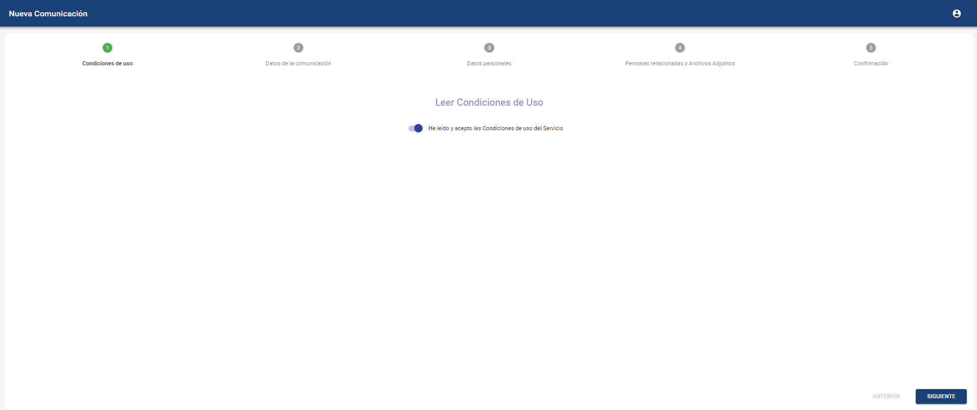 Formulario general para la redacción de la comunicación. Se podrán completar los campos disponibles, pudiendo incluir campos obligatorios necesarios para registrarla. En caso de existir, no se podrá pasar al siguiente paso hasta que estén completos. Estos campos podrán ser desplegables de opciones, campos textuales, fechas o checks.