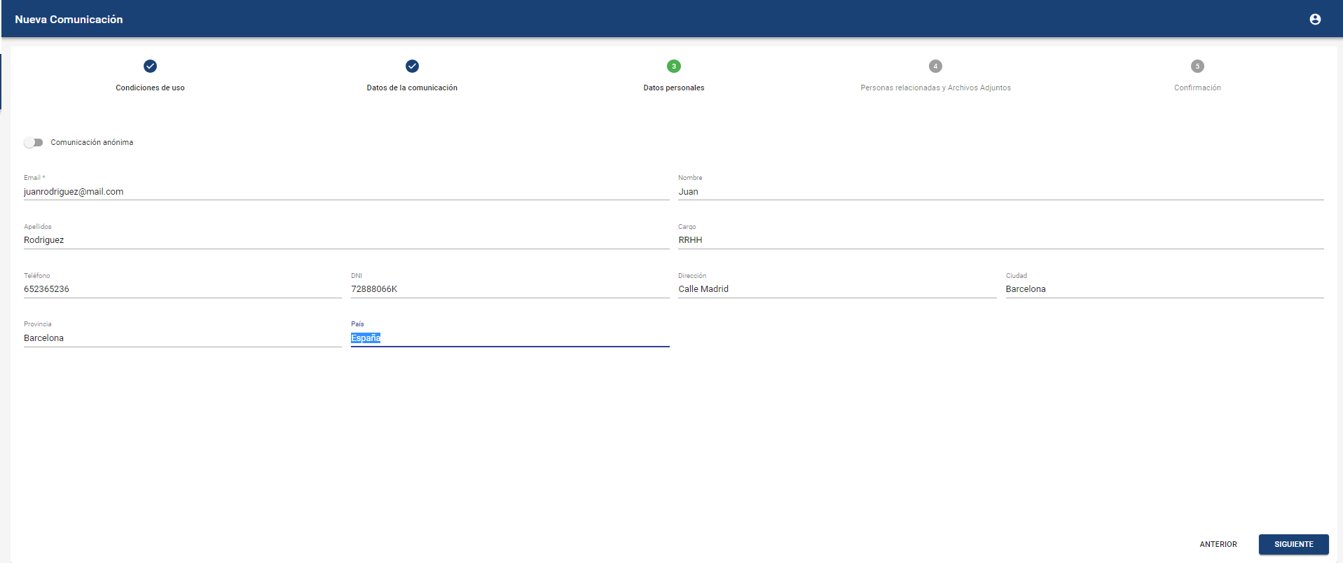 Datos personales del comunicador. En función de la configuración, se podrá mandar el comunicado como anónimo, o será necesario identificarse. En ese caso, el comunicador deberá completar al menos el campo "Email" para poder realizar el envío.