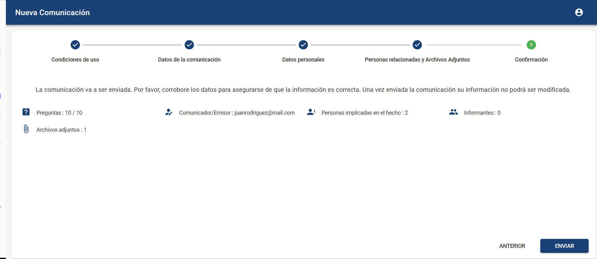 Vista de resumen del comunicado a enviar, indicando cuántas preguntas de las disponibles en el formulario se han completado, si se ha adjuntado algún archivo y la información del comunicador o y si existen personas involucradas.