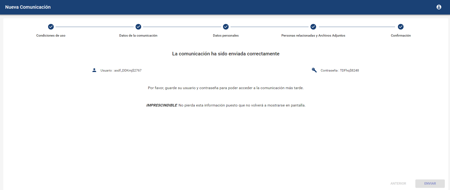 NOTA IMPORTANTE: Es muy importante almacenar las credenciales que aparecen en el último paso, sobre todo en caso de realizar una comunicación anónima, porque al finalizar el proceso no se podrán recuperar, y es la única forma de poder hacer seguimiento de la comunicación realizada.