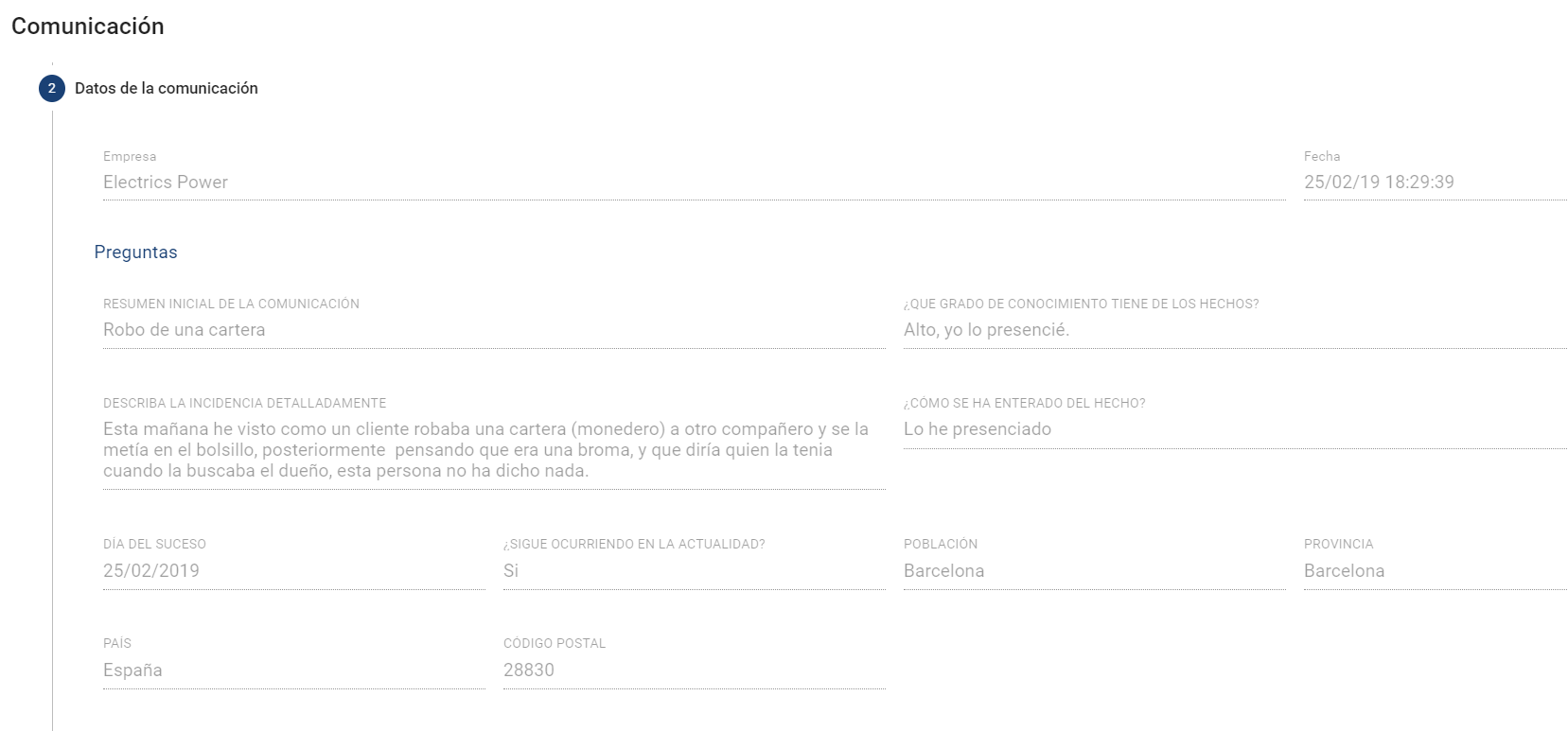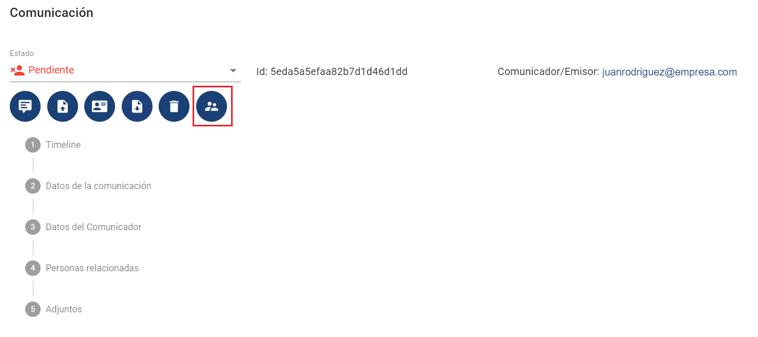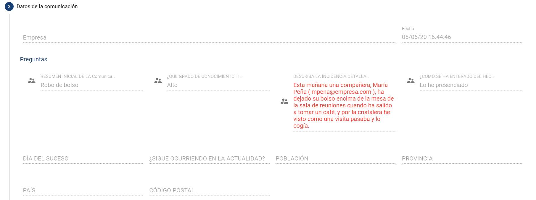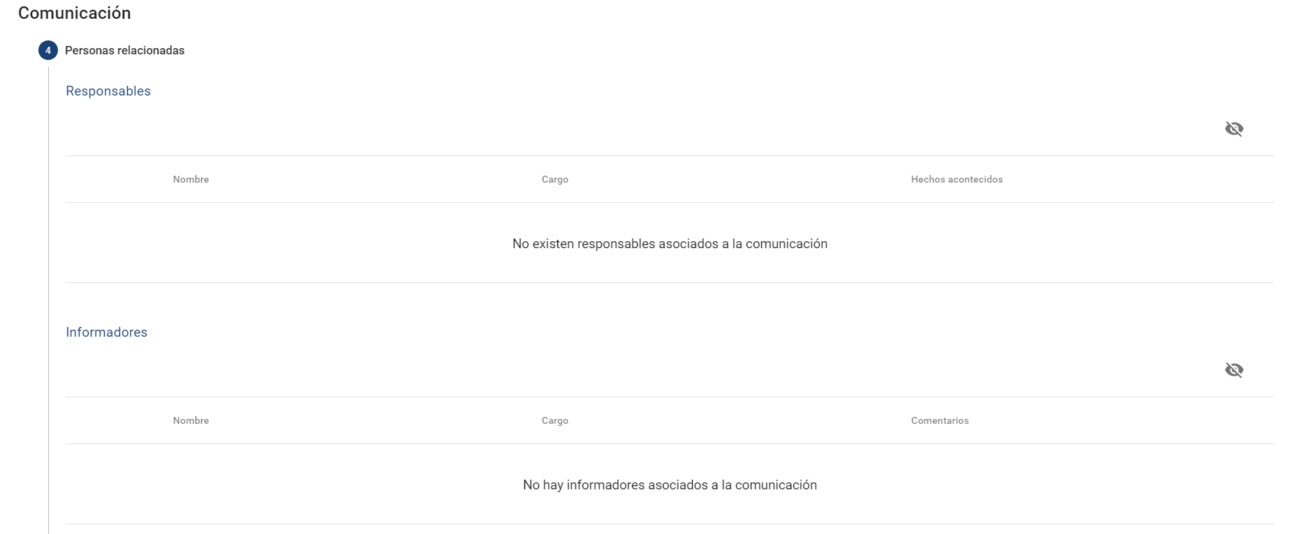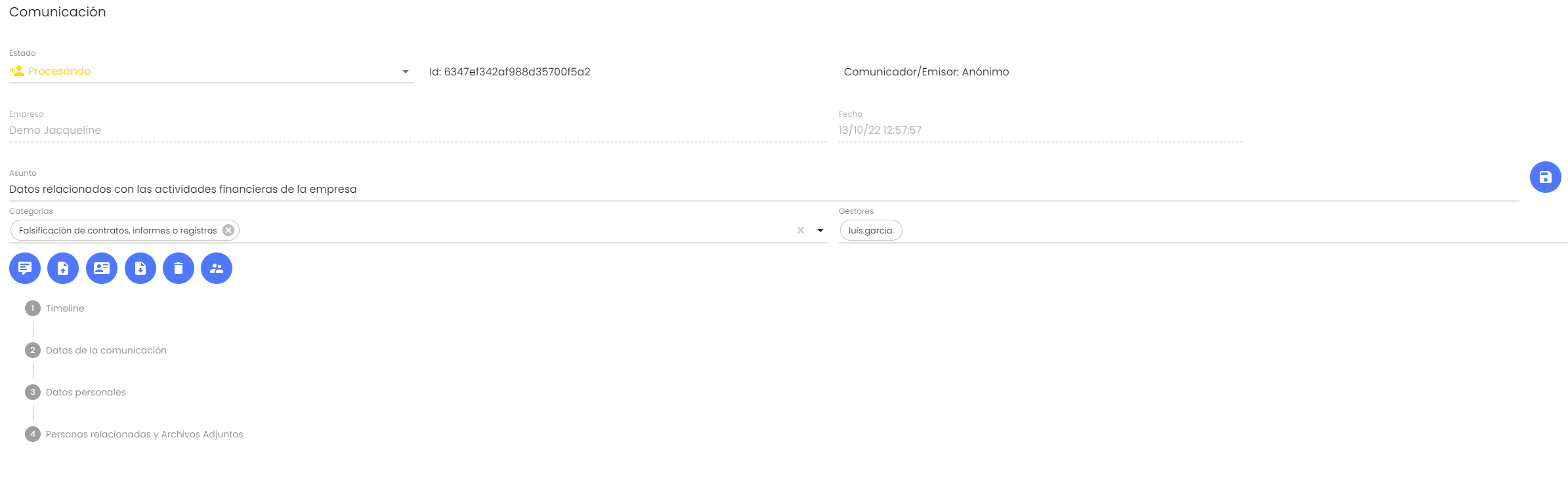 En esta sección se podrá realizar la gestión de la comunicación, para ello podremos ver el formulario general completado por el comunicador, personas responsables del suceso, personas informantes, documentación adjunta.
