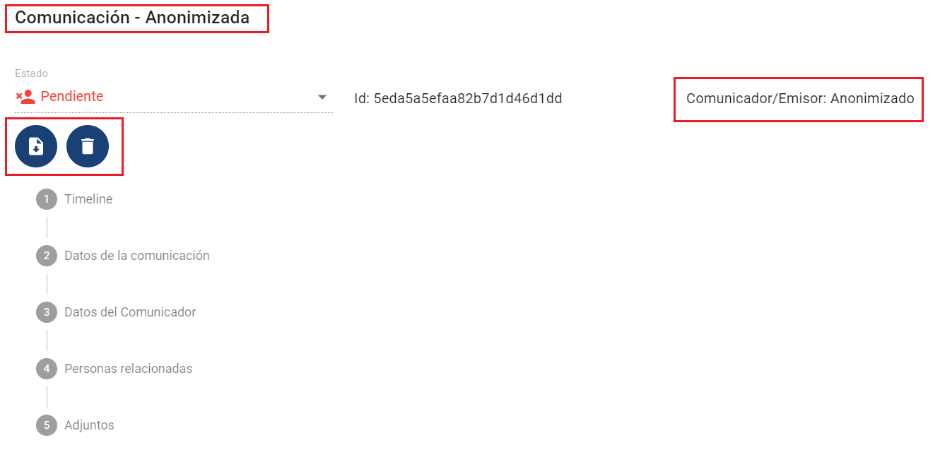 Una vez finalizada la gestión de la comunicación, o en caso de que haya superado el plazo máximo previsto (la comunicación esté Caducada), es posible anonimizar los datos de carácter personal de la misma.