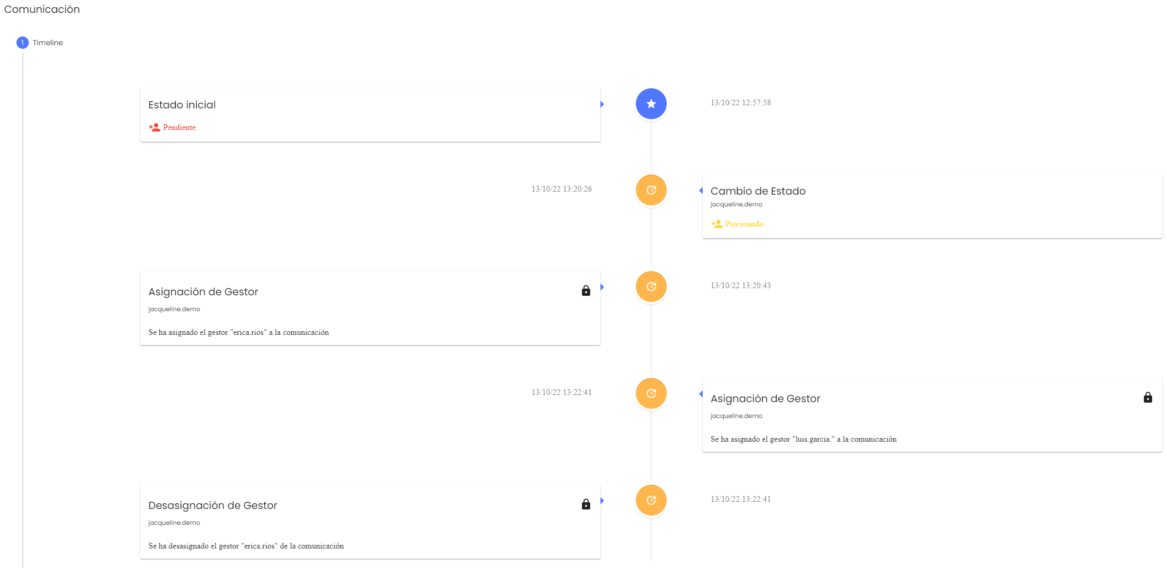 La acción de asignar o desasignar un gestor de la comunicación, generará una entrada en el Timeline de la misma, para poder visualizar en qué momento se realizó.