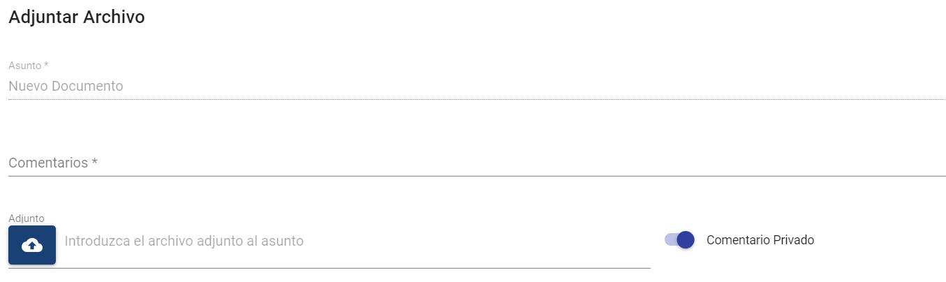 Adjuntar Documentación → Podremos adjuntar documentación para la gestión de las comunicaciones, quedarán accesibles desde el Timeline. En caso de que queramos que el documento se pueda descargar por parte del Comunicador/Emisor, deberemos desmarcar el check de "Comentario Privado". Si no, solamente estará disponible por parte de los gestores y administradores del entorno.