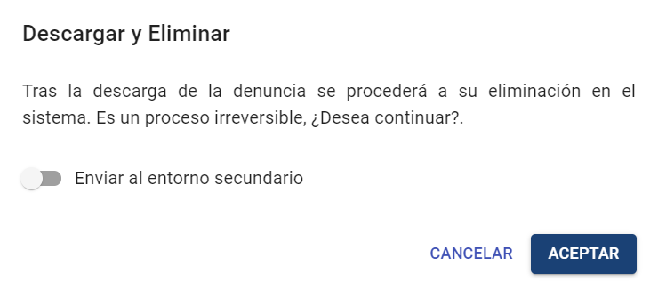 En caso de que esté habilitado el Entorno Secundario (ver Configuraciones), en la petición de confirmación se podrá marcar que antes de eliminar la comunicación la envíe al entorno secundario habilitado.