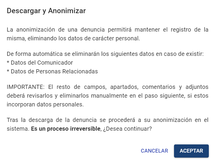 Cuando se anonimice la comunicación, esta podrá seguir gestionándose internamente, añadirse nuevos comentarios o documentos y cambiar de estado. Sin embargo no se podrá comunicarse con el denunciante (al haberse eliminado los datos personales), ni consultarse por el comunicador desde el portal.