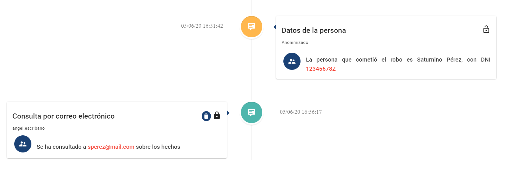 En esta pestaña podremos ver todo el avance de la denuncia, con un Timeline de todo los sucedido, cambios de estado, comentarios, documentación adjuntada, la asignación de Gestores, así como el detalle de que usuario ha realizado cada avance.