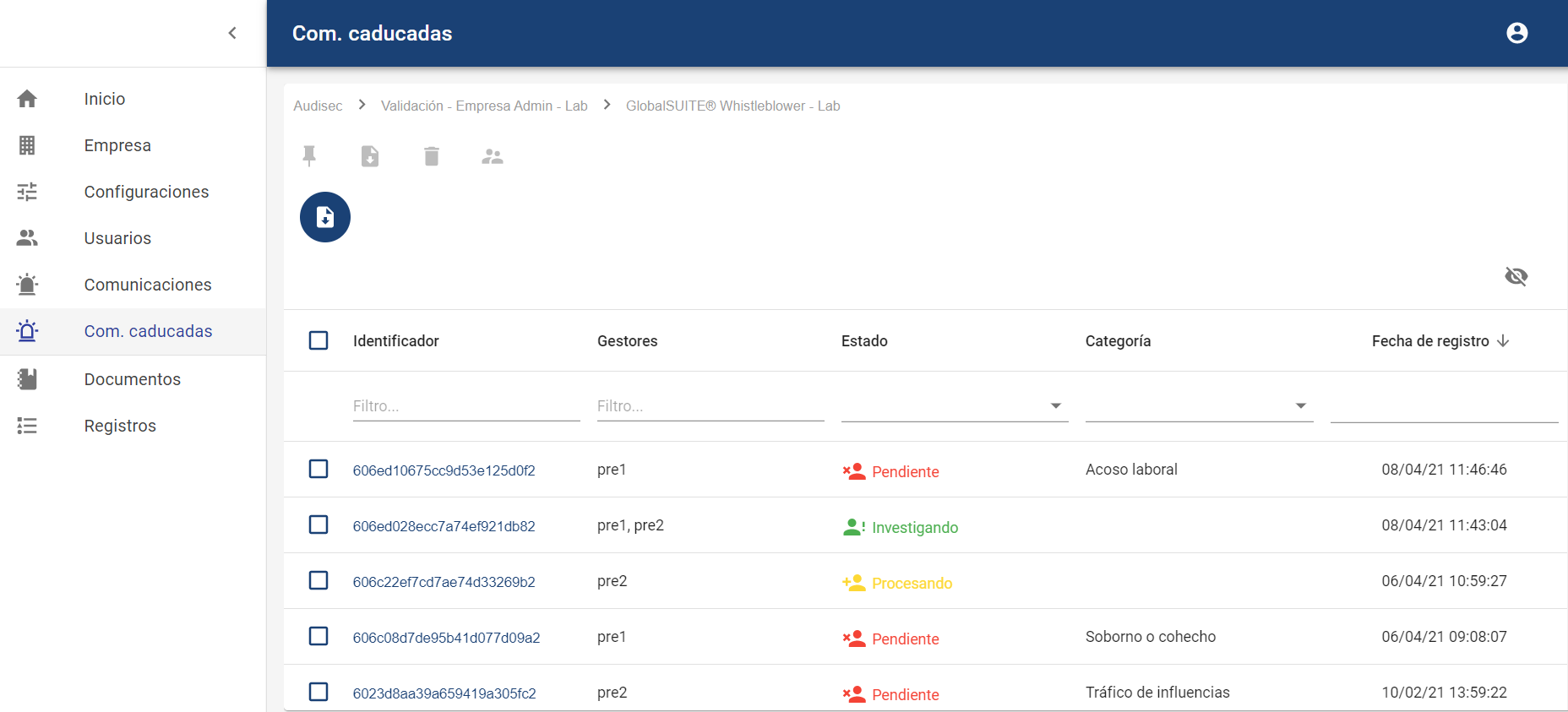 En esta primera vista podremos ver el ID de la comunicación, Gestores asignados a la comunicación, Estado en el que se encuentra y Fecha de creación.