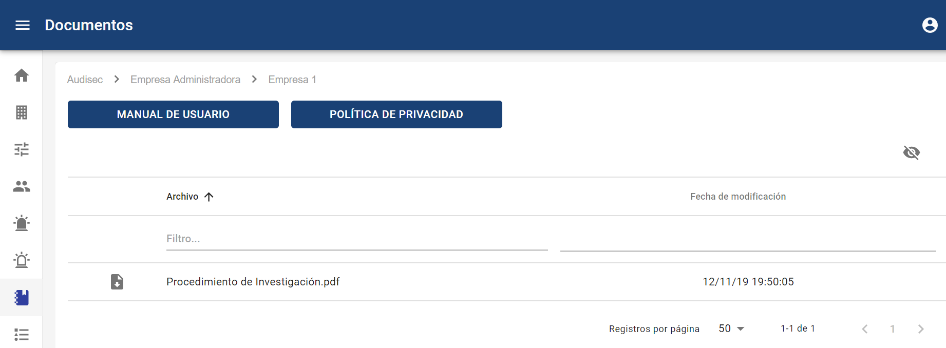 Además, en caso de que se hayan subido documentos de apoyo en el apartado de Configuraciones(en el idioma del usuario), aparecen en la tabla inferior para poder descargarlos a través del icono de la parte izquierda de la tabla.