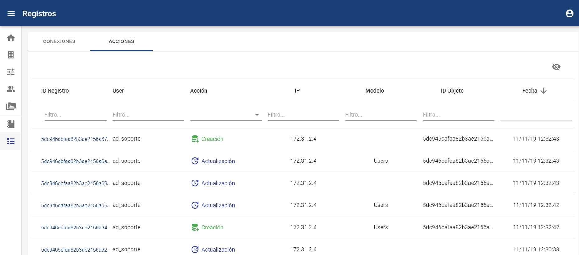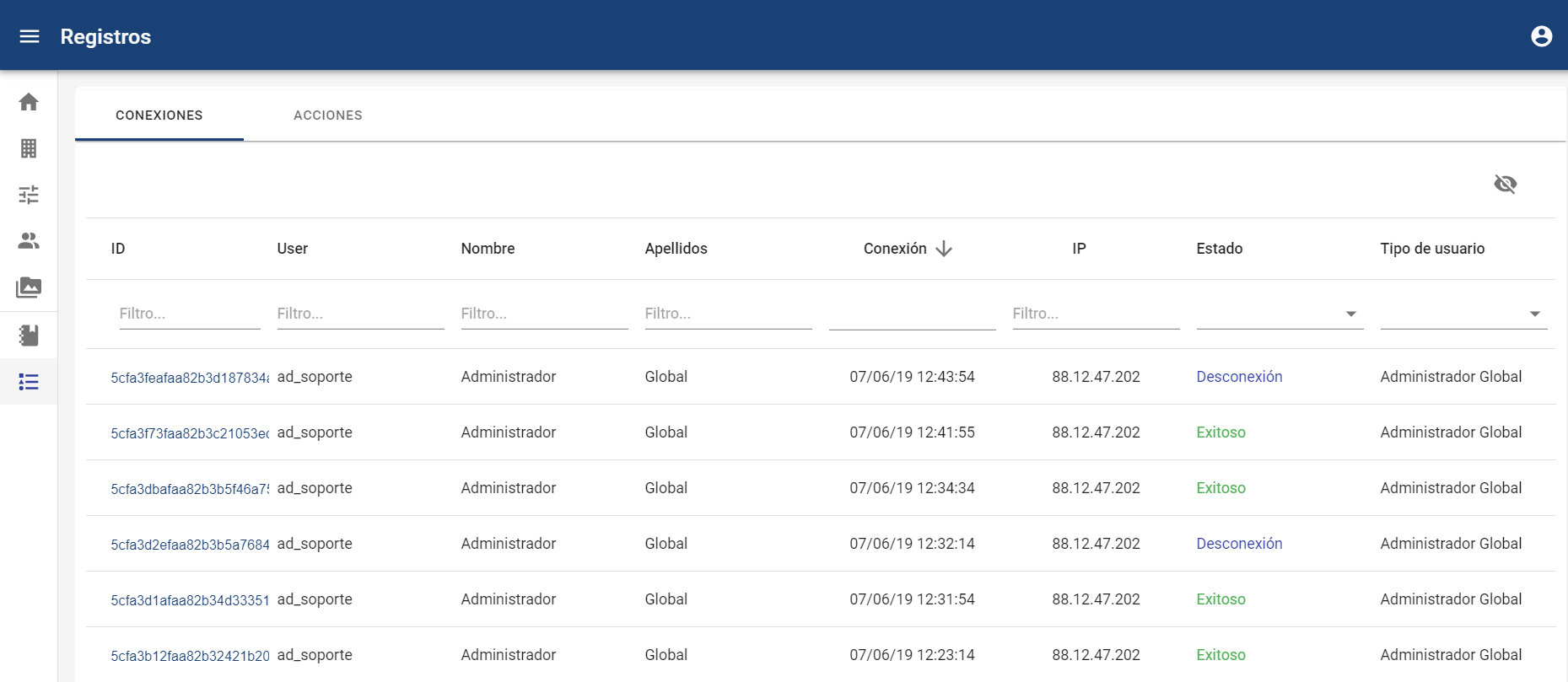 En esta pestaña podremos ver todos los intentos de conexión a la herramienta, tanto correctos como incorrectos.