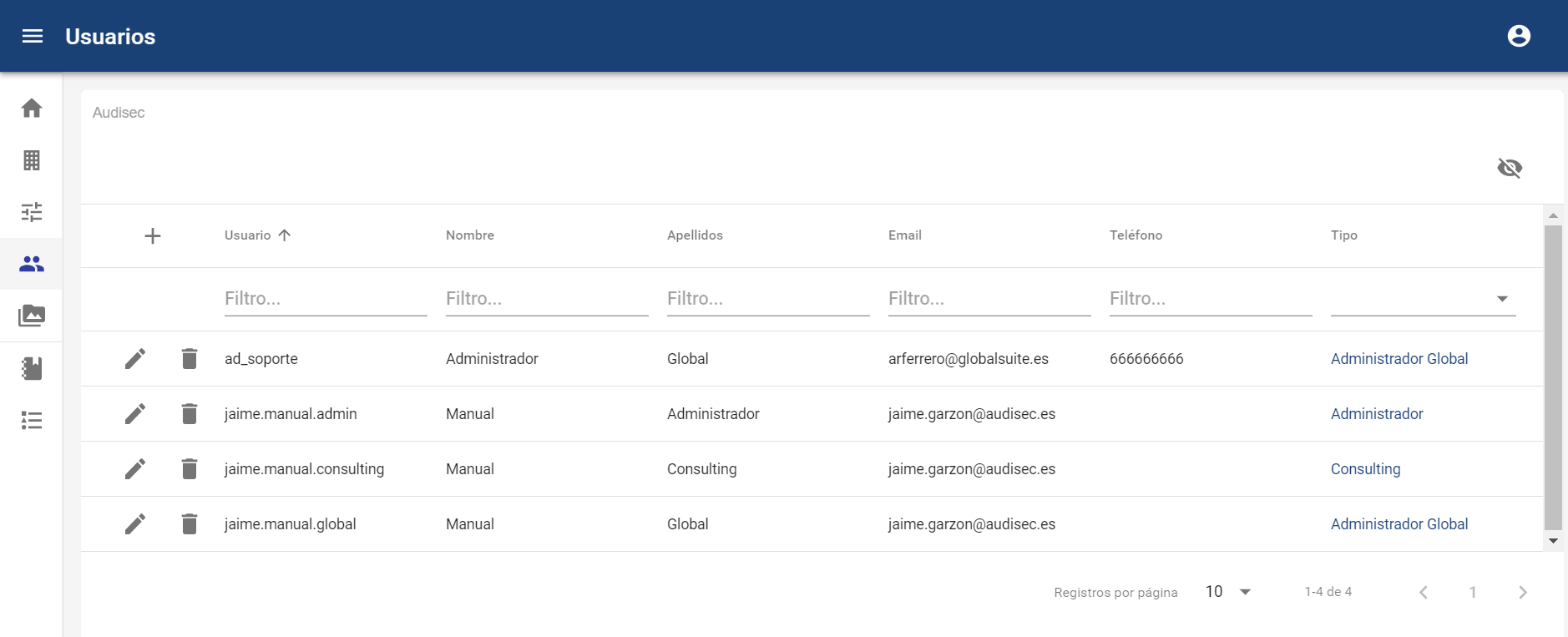 Usuario que tendrá la posibilidad de acceder a uno o varios canales de comunicación, dentro de estos, tendrá acceso a la visualización y gestión de comunicaciones. Podrá asignar comunicaciones a los gestores. Este usuario solo podrá realizar todas las acciones anteriores, en empresas Consulting (Canales de Comunicación) a las que un Administrador Global o Administrador le haya dado acceso.