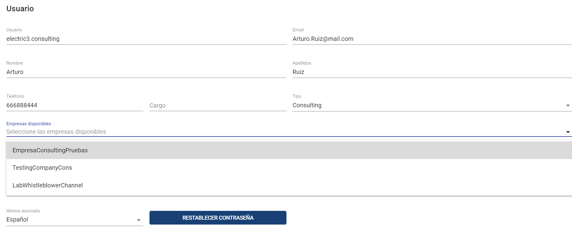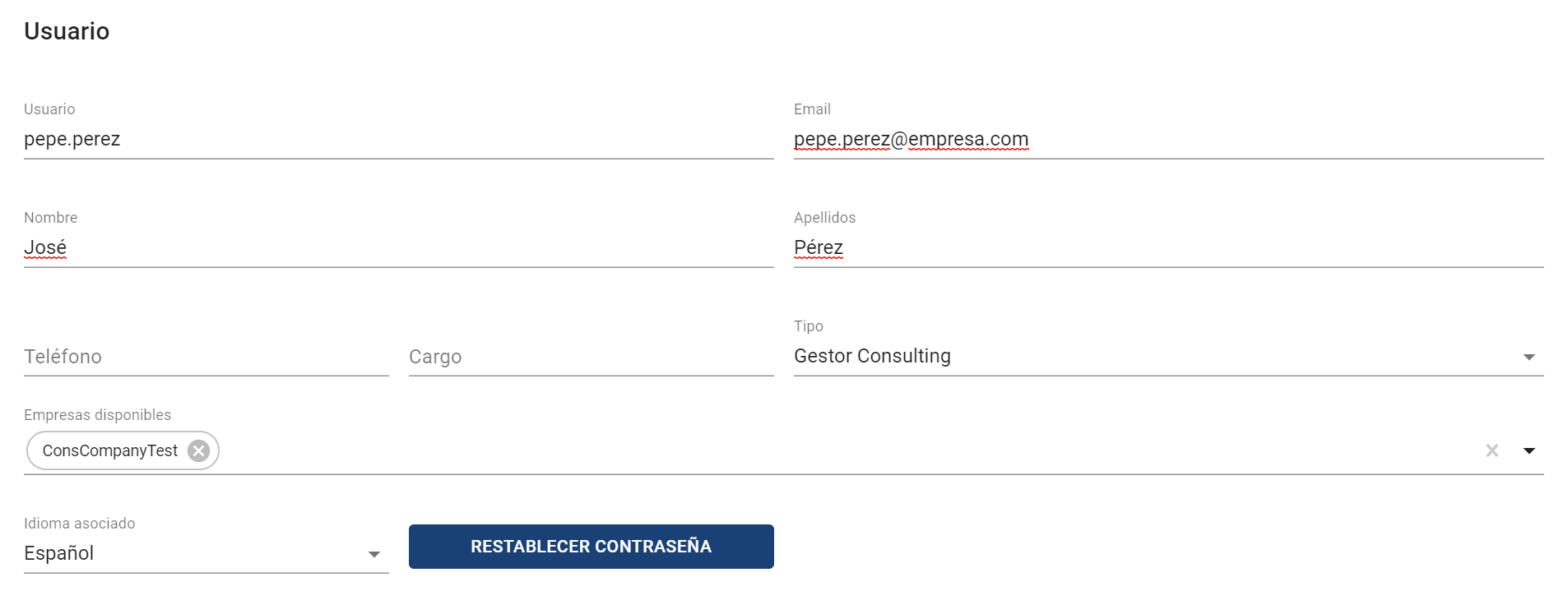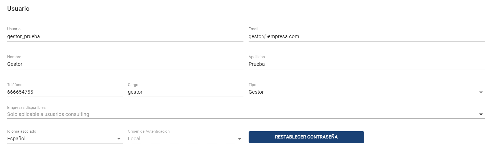 Es posible restablecer la contraseña a un usuario, a través del botón correspondiente disponible en su ficha. Al pulsarlo, se generará una nueva contraseña temporal que se le enviará por correo (el usuario deberá cambiarla en el primer acceso.