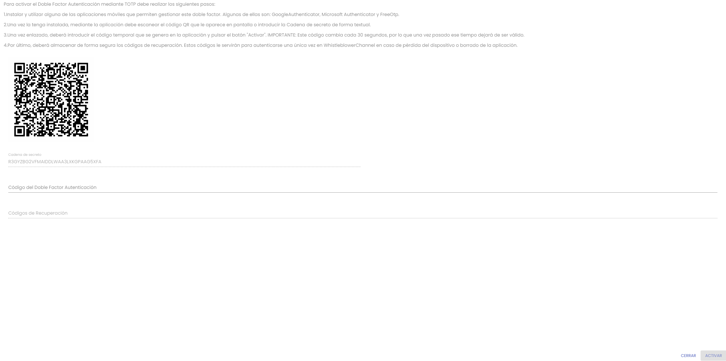 Una vez realizados los pasos indicados, se deberá pulsar el botón "ACTIVAR". Se generarán códigos de recuperación, que sirven para que en caso de perdida del dispositivo o de la aplicación que genera los códigos, se puedan introducir estos códigos a modo de reemplazo. Cada uno de estos códigos son de un solo uso.