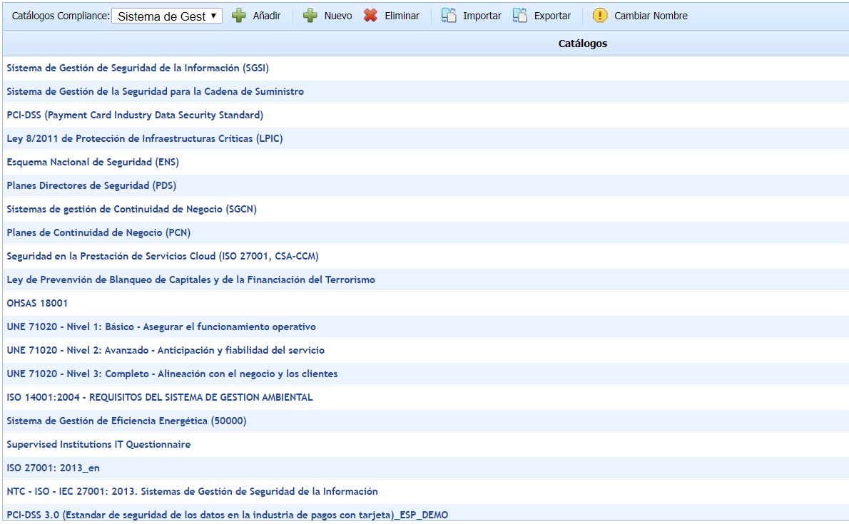 The 'Compliance Catalogs' option offers the possibility of having regulatory compliance catalogs (security, quality, environment, etc.) already generated in the tool or creating a custom catalog. These catalogs will be necessary for the 'Gap Analysis' option.