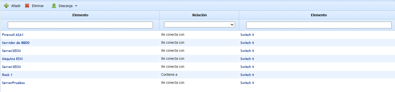 Filters: Allows filtering to visualize the different relationships of the selected item. Level 1 shows the relationships of the item with the most direct ones. Level 2 shows the relationships of the selected item with the most direct ones and the relationships of the latter with their own, etc. The Related filter shows all the CMDB items that are related to each other, and the All option shows the list of all CMDB items, whether related or not.