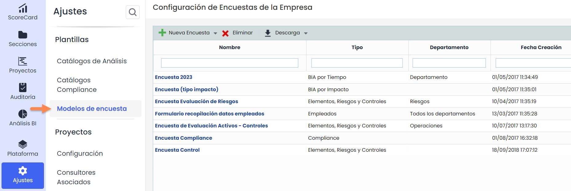 GlobalSuite® allows identifying and classifying the inventory of items, performing risk analysis, and evaluating the organization's controls through surveys sent to various responsible parties within the organization. To do this, the survey template to be sent must first be created. Multiple templates can be created and configured to adapt them to the organization's needs.