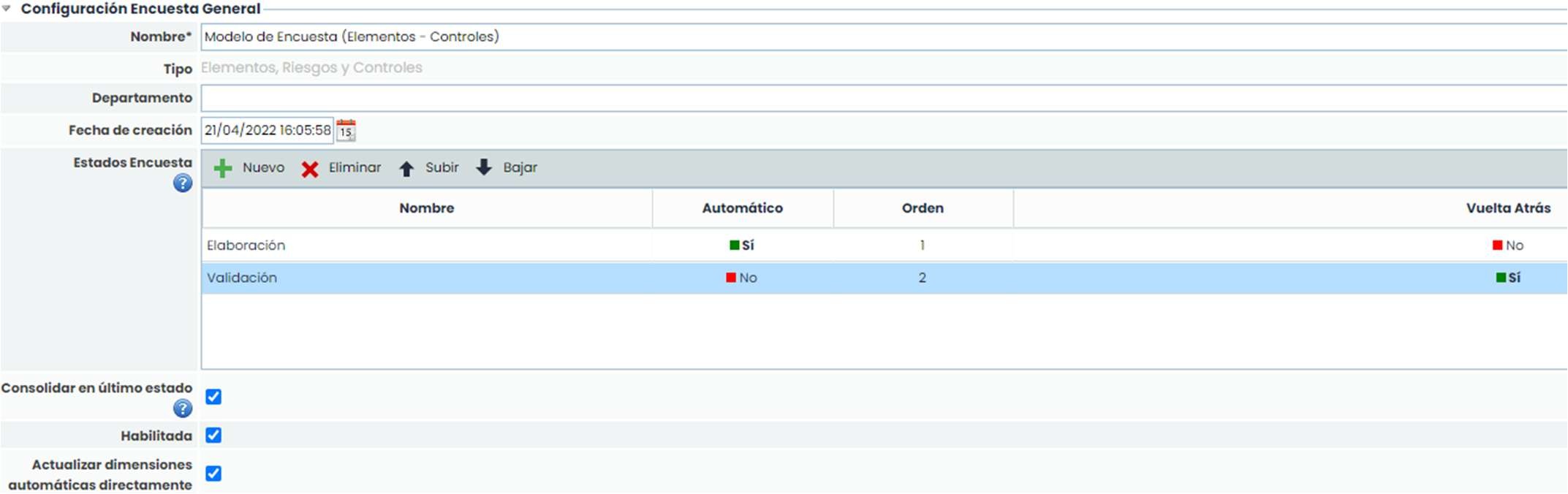 Within the survey model, you can configure aspects such as the name, department, or creation date, as well as indicate whether the model should be enabled for use and whether you want to “Consolidate in the last state,” meaning that from the last state of the workflow, the survey data can be directly consolidated into the final analysis.
