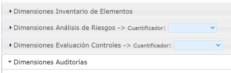 Evaluación Controles: estas dimensiones tienen cuantificadores para relacionar los resultados de todos los registros de Gestión de Controles (metodología de controles) vinculados al análisis de riesgos que utiliza como metodología de riesgos la que se ha asociado previamente a esta metodología de auditoría. Esta relación se realiza mediante: contador, máximo, mínimo y/o sumatorio.