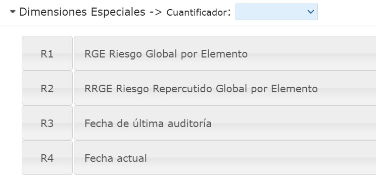 Dimensiones Especiales: utilizan cuantificadores para relacionar resultados de los siguientes conceptos: a) RGE Riesgo Global por Elemento: para el cálculo del riesgo agrupado por elemento.