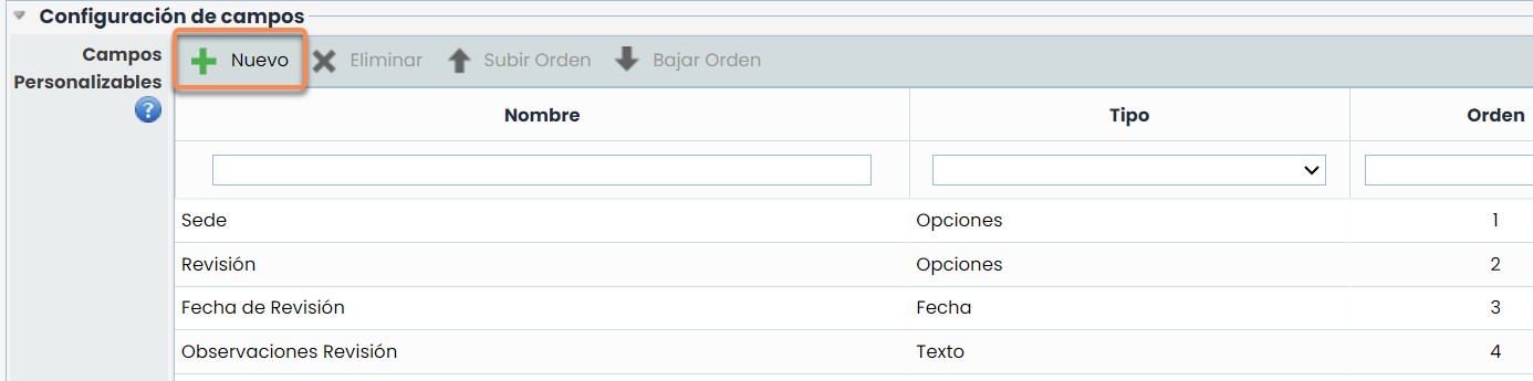 El botón Nuevo permite añadir campos adicionales de tipo Fecha, Texto y Selector.