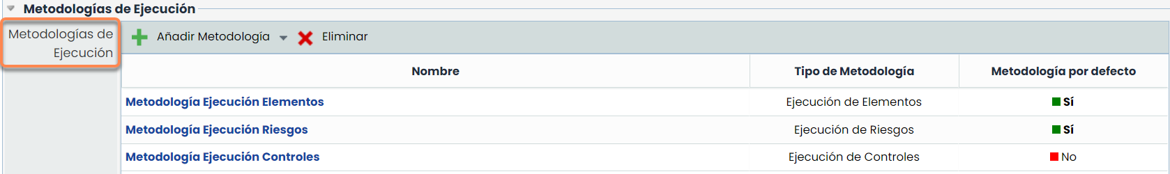 Dentro de la metodología de auditoría se encuentran las metodologías de ejecución. La funcionalidad de dichas metodologías es poder ejecutar "Trabajos de Auditoría" para auditar elementos, riesgos y controles. Las metodologías existentes son: