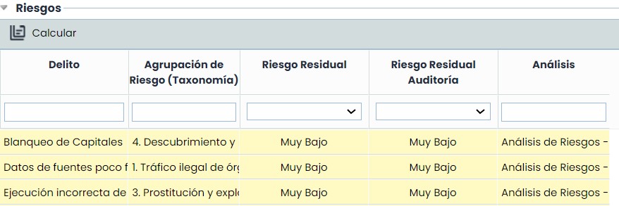 Para poder visualizar la información del punto anterior, se tendría que seleccionar el elemento de la tabla superior para que se puedan visualizar los riesgos y las dimensiones a valorar.