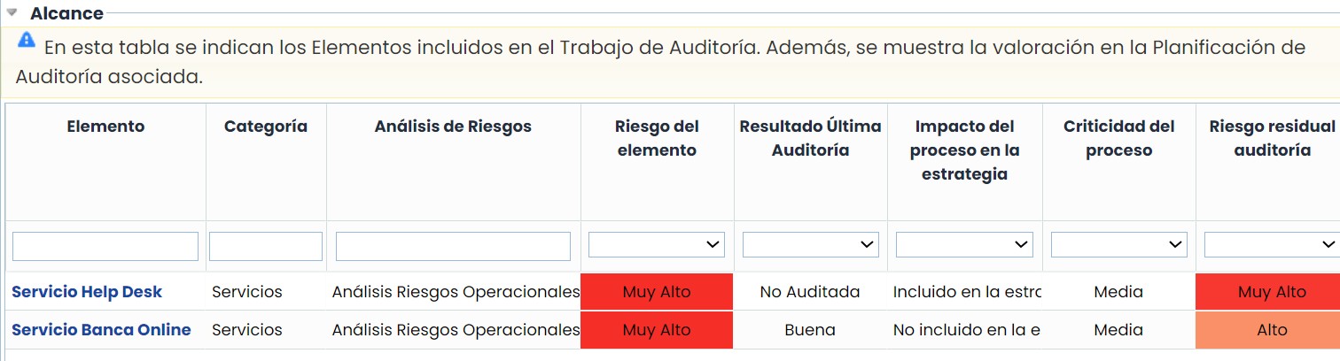 La metodología de Ejecución de Elementos permitirá incluir dimensiones específicas para la valoración de los “elementos” definidos en el inventario y que fueron agregados a un análisis de riesgos. En el apartado de auditoría, los elementos serán seleccionados dentro del apartado “Plan de auditoría” ya que ahí se relacionarán con su respectivo “Programa de Auditoría”.