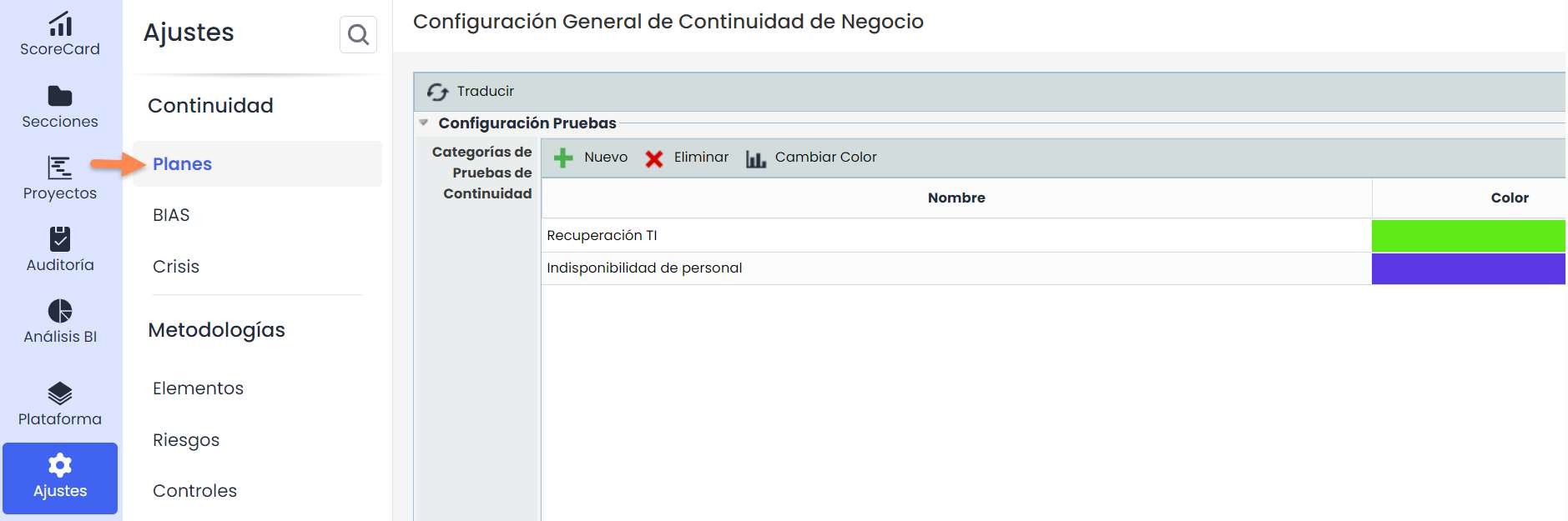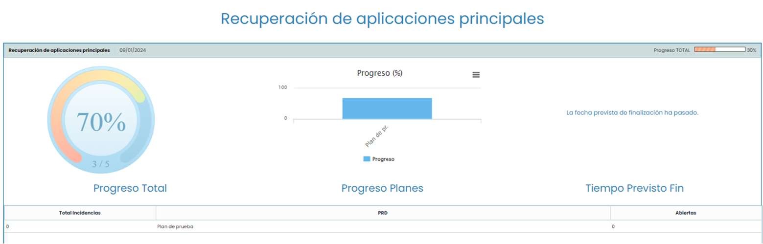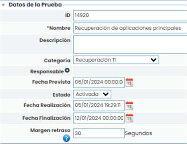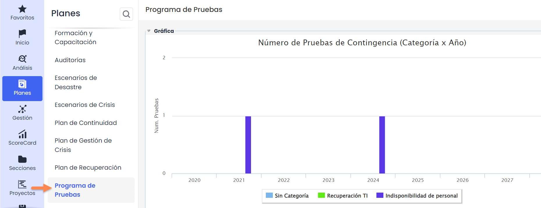 Once the BIAs and Recovery Plans (DRP) are defined, the “Testing Program” option is available, which allows simulating recovery plans. However, it does not necessarily have to be the entire plan; it can also be individual sequences to ensure those sequences are well-defined. In other words, it is not a simulation of a recovery plan but rather testing different sequences to verify their correct functionality.