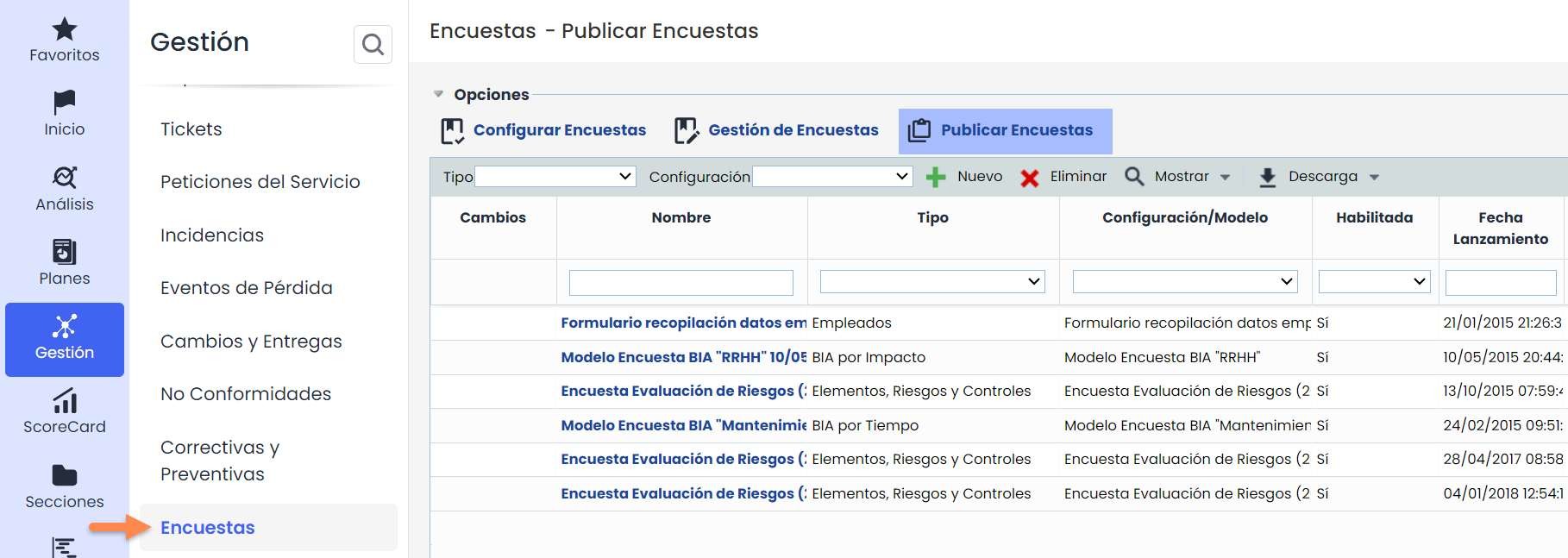 Once the survey model and its configuration have been set up, it is time to create the publication. To do this, go to the “Surveys” option located in the “Management” tab and select the “Publish Surveys” icon.