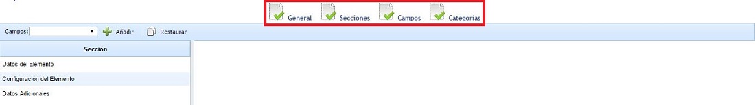 The first time the "Restore" button is pressed, the solution automatically loads the 3 sections that make up the information of a CI in the original configuration into the left table: "Item Data", "Item Configuration", and "Additional Data". Additionally, after pressing the "Restore" button, it can also be observed that the tabs in the "CMDB" option have been expanded, adding the "Sections" and "Categories" tabs to the "General" and "Fields" tabs.