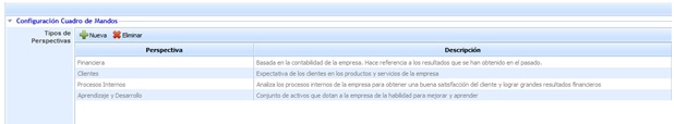 Types of perspectives: Provides the ability to identify the different perspectives displayed in the 'ScoreCard/Business Objectives' section. To insert a new perspective, the 'New' button must be clicked, and if the user wishes to delete a perspective, they must click the 'Delete' button.