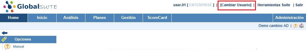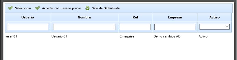 Select: It allows you to access with the credentials of one of the users in the table previously selected. In this way the user can access to the company which are linked to the selected user. Only access with your own user: Permite acceder a la empresa a la que pertenece su usuario, siempre y cuando cuente con permisos para ello. Logout GlobalSUITE: It allows you to logout the plataform without accessing to any of the companies associated with the user. Once accessed you can change the type of access by clicking on the link of the top part of the window (Change User).