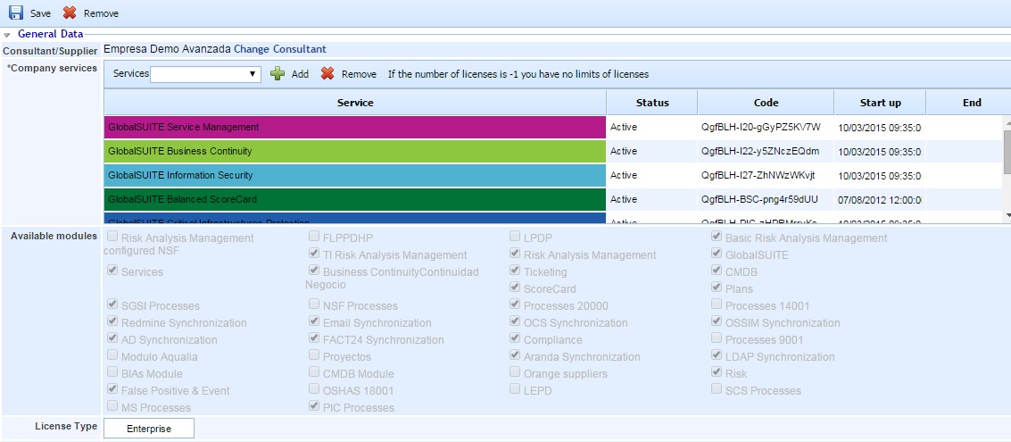 It allows you to view the information of the services and module you have hired in GlobalSUITE® by the company you have selected previously. Information such as hired services, available modules and the type of license.