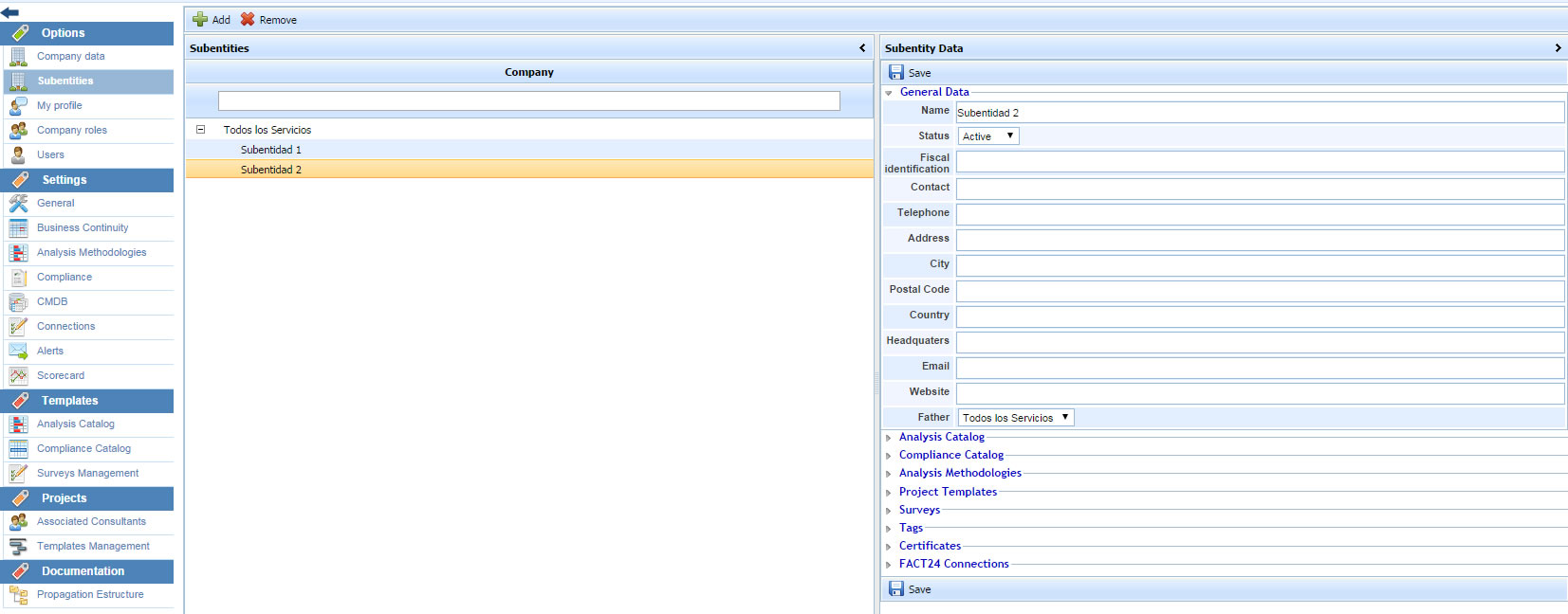 NOTE: The option ‘Father’ allows the user to assign to the subentity the father entity required if necessary. For this task, the subentity should have the same options (analysis catalogs, compliance catalogs, etc.) than the father entity.