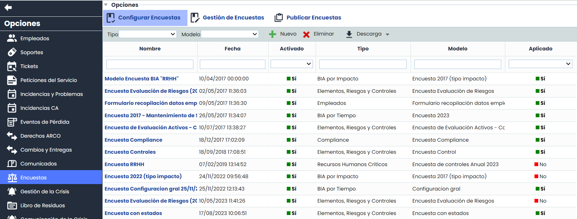 The 'Surveys' section allows the user to obtain information from different resources or departments of the organization about those questions defined in the Survey Templates section.