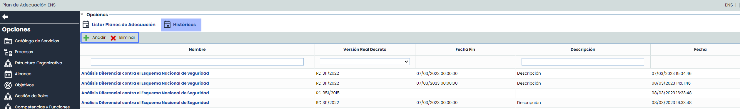 En esta sección, se podrán realizar y almacenar históricos lo cual permitirá realizar comparativos y visualizar la evolución de los planes de adecuación del Esquema Nacional de Seguridad (ENS).