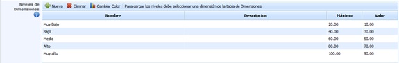 Allows defining the valuation levels of the selected dimension. As with the other options, levels can be created and deleted, as well as configuring the desired color to highlight the levels during valuation by selecting the level to modify and clicking the 'Change color' button.