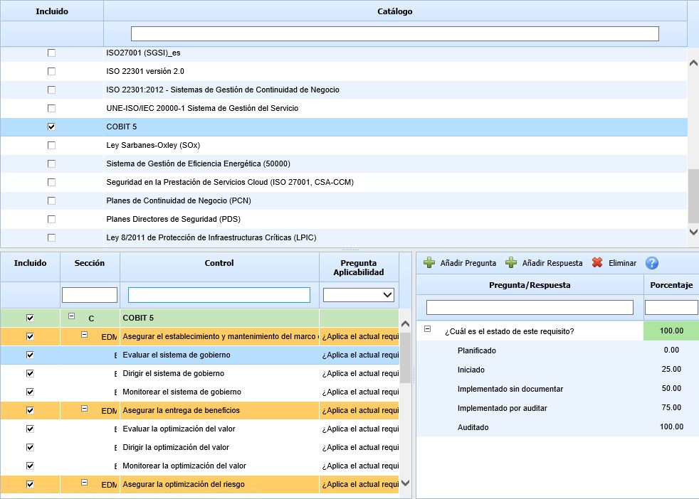 Questions: By selecting the row of one of the catalogs, the questions for each of the catalog's requirements or controls are customized. When clicking on the catalog, a list of controls or requirements of the catalog is displayed at the bottom along with a column on the right side to indicate the question about the control. When clicking on the question, a new table is displayed on the right side where you can indicate the questions that will be associated with that control or requirement. The customization of the questions is carried out with the following buttons: