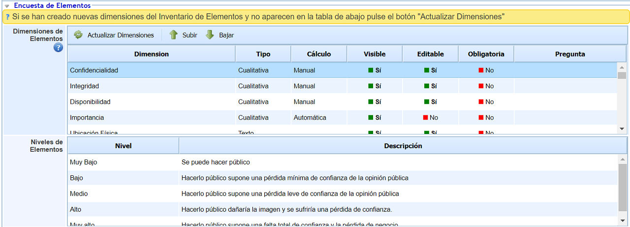 The information provided by the tool includes the dimensions based on which the survey and evaluation of the risks of the items will be conducted, dimensions that have been configured in the 'Settings/Analysis Methodologies/Analysis Methodologies' section.
