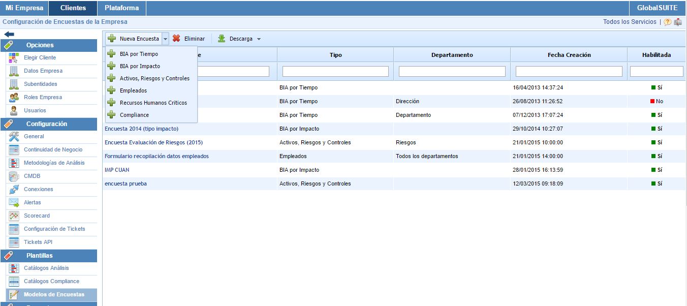 The survey templates section allows the user to create a pattern for conducting different surveys based on the GlobalSUITE® products. The types of surveys are: