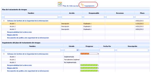 Risk treatment plan: On one hand, the parameters defined in the Adaptation Plan section, such as the task list, responsible persons, completion deadline, etc., are displayed informatively. When one of these elements is expanded, the degree of implementation of the defined tasks can be established. To do this, the desired cell in the status column must be double-clicked, and the progress level selected. By default, the tool proposes the levels Not Implemented, Partially Implemented, and Implemented, but they can be parameterized in the 'Settings' section. As they are filled in, the 'Progress' column will be recalculated automatically.