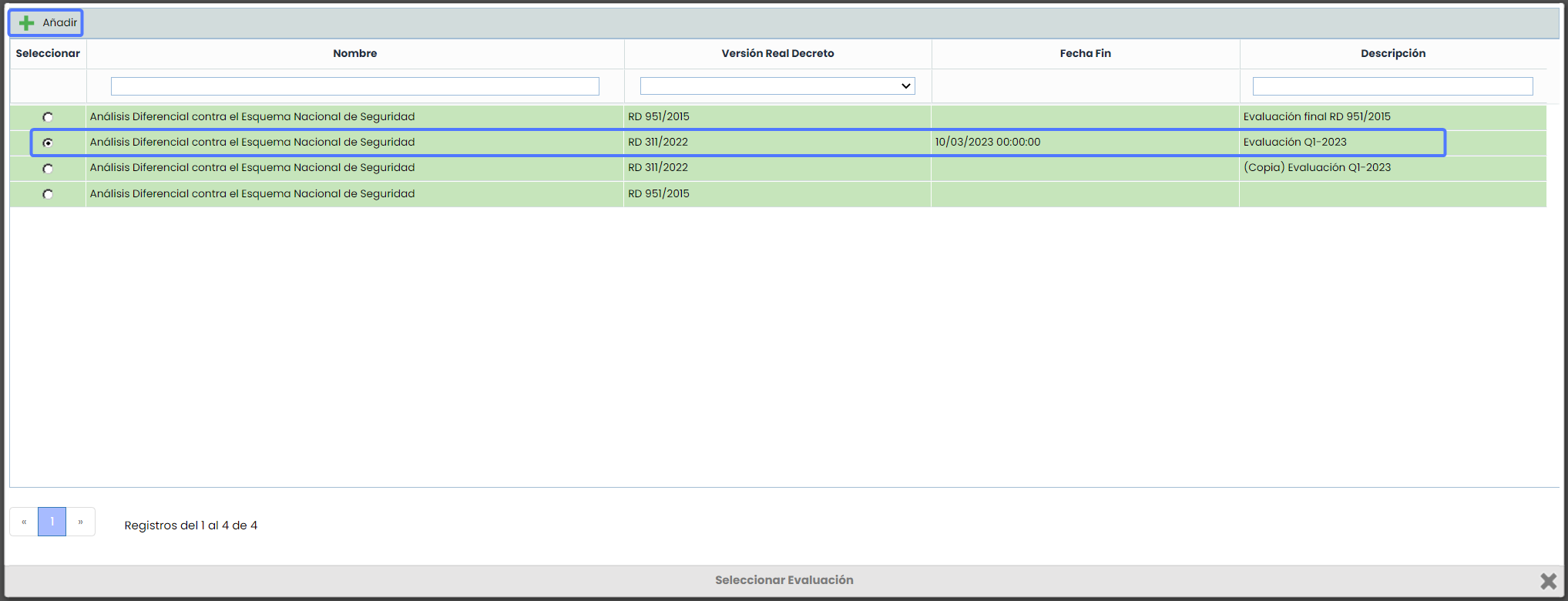 En esta ventana encontrarás un listado de todas las evaluaciones de Medidas de Seguridad que han sido valoradas. Para crear un Plan de Adecuación para alguna de las evaluaciones de la lista, deberás seleccionarla y luego pulsar en "Añadir".