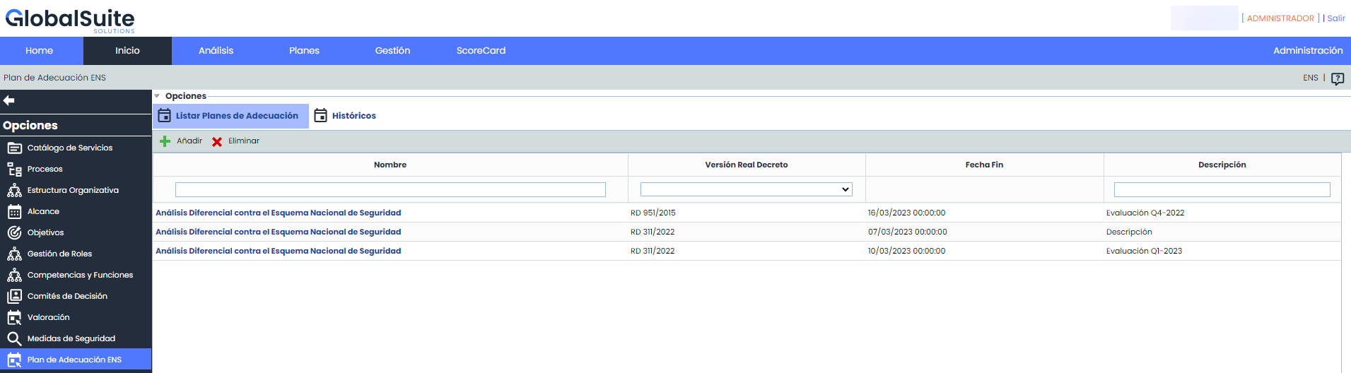 En este apartado de GlobalSUITE® se encuentran las opciones y apartados correspondientes al Plan de adecuación ENS