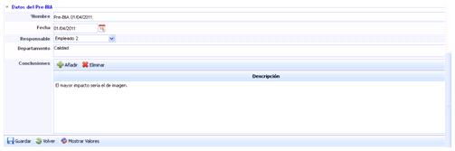 Conclusions: Allows identifying the conclusions related to the results obtained in the impact analysis by clicking the ‘Add’ button. If you want to delete a conclusion, select the desired row or rows and click the ‘Delete’ button.