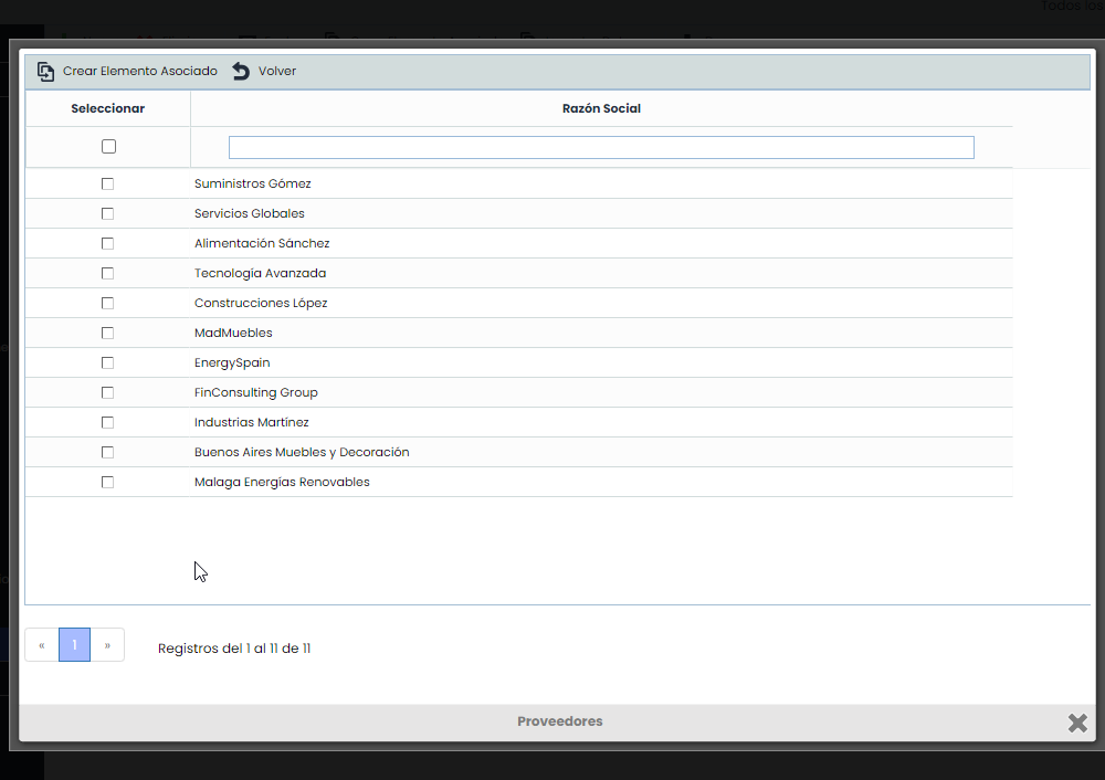 When you click on the option, a pop-up window will appear where you can select one or more suppliers to create an associated element for them.